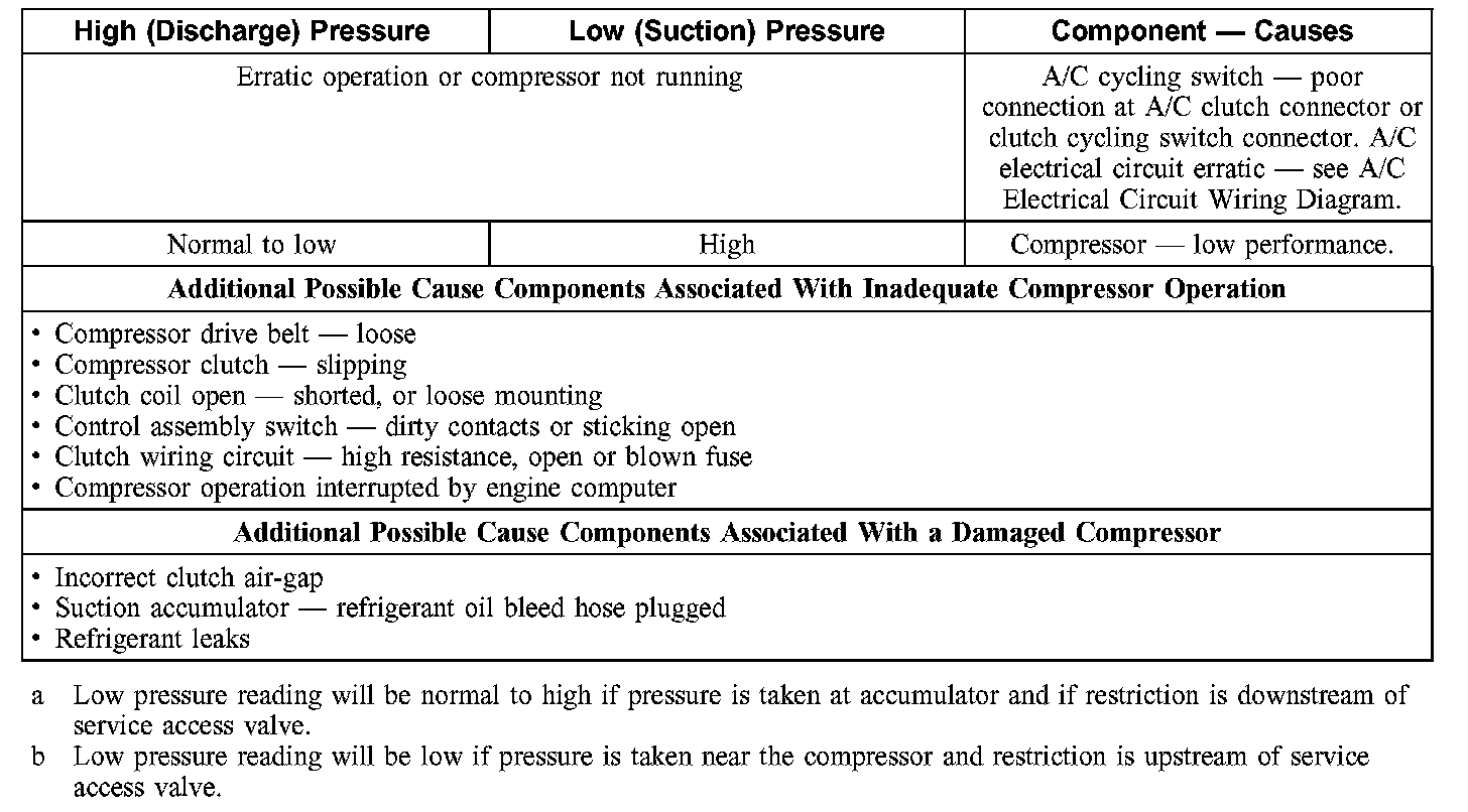 NOTE:The table is used to guide diagnosis of the refrigerant system if operating pressures are outside normal limits.