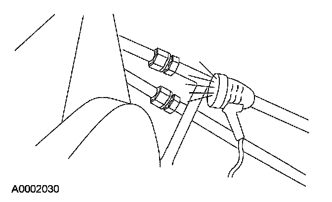 NOTE: Ford Motor Company vehicles are produced with R-134a fluorescent dye installed in the refrigerant system from the factory. The location of leaks can be pinpointed by the bright yellow-green glow of the fluorescent dye under a UV lamp. Since more than one leak can exist, make sure to inspect each component, line and fitting in the refrigerant system for a leak.