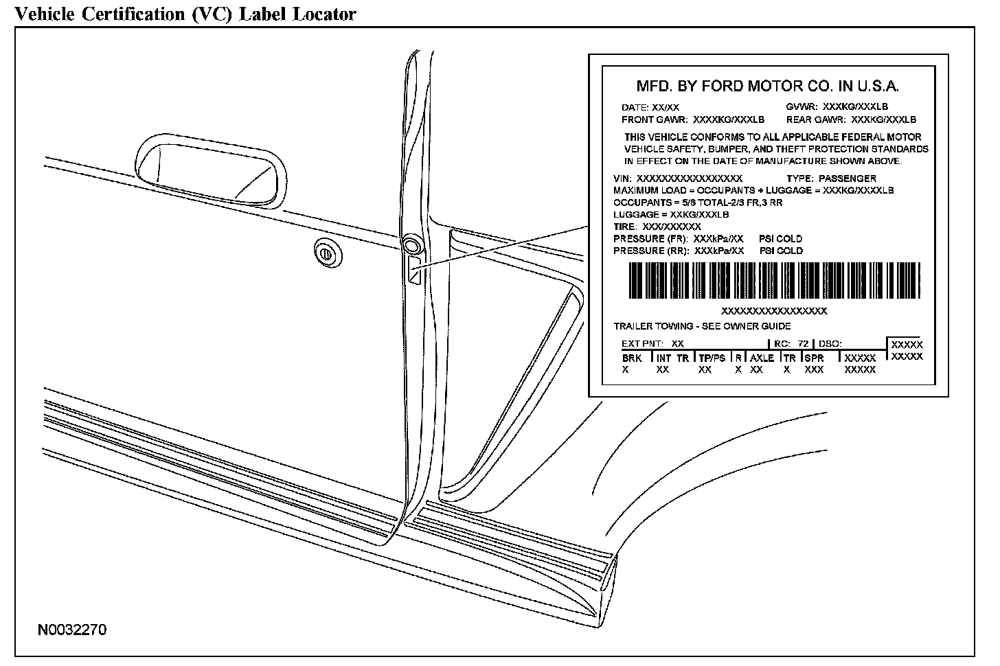 The upper portion of the vehicle certification (VC) label contains the manufacturer name, the month and year of manufacture, the certification statement and the vehicle identification number (VIN). It also includes gross vehicle weight ratings (GVWR). The VC label is located on the LH door jamb.