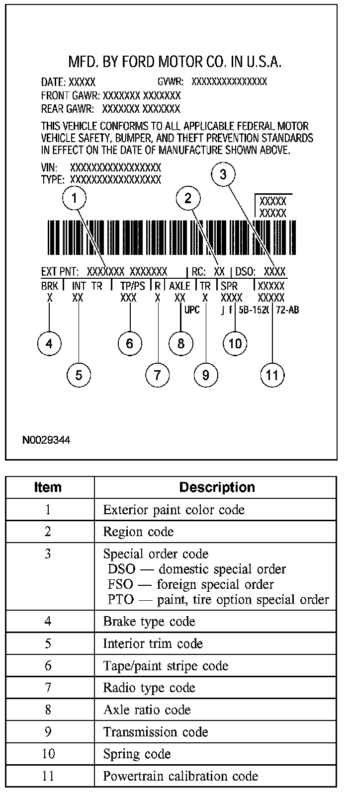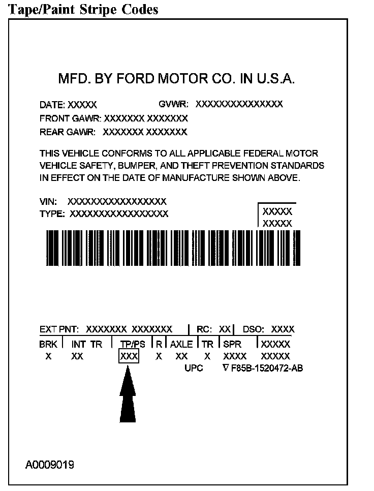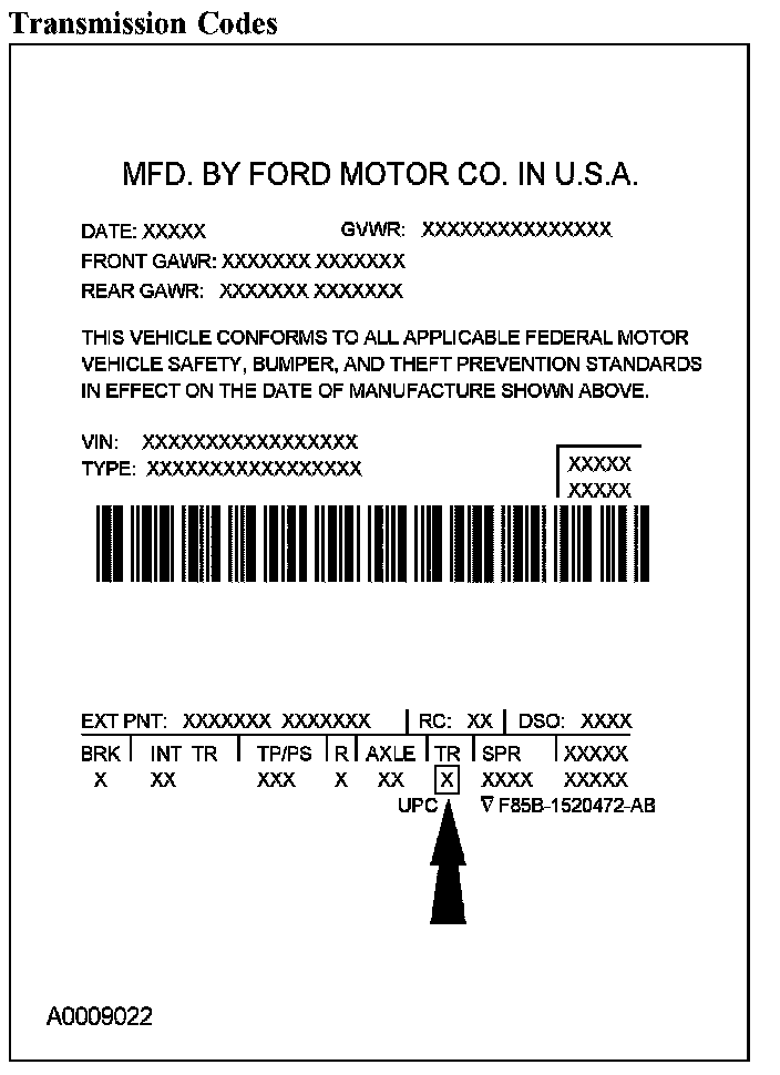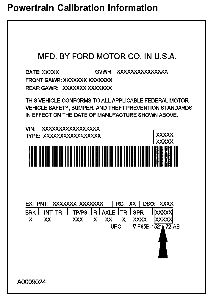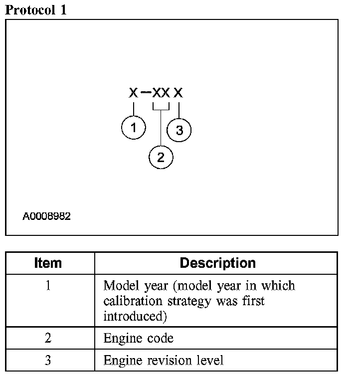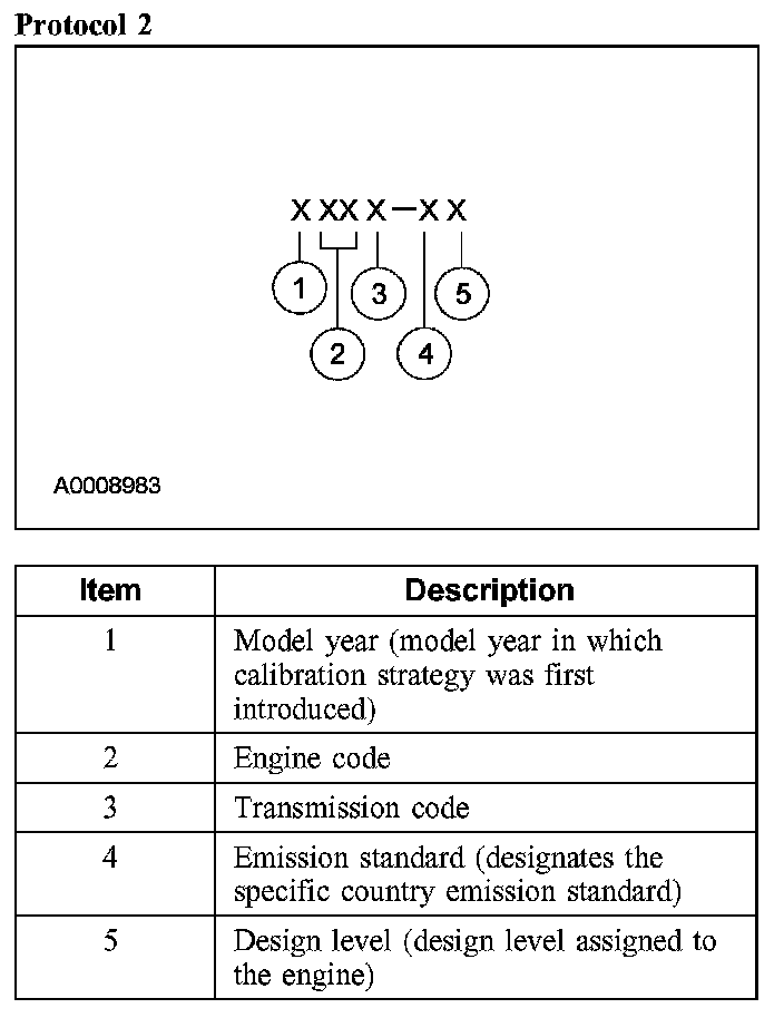 Powertrain calibration information is printed in the lower right corner of the Vehicle Certification Label. Only the base calibration information is printed. Revision levels will not appear, however, this information can be found in the On Line Automotive Service Information System (OASIS). For the current model year, Ford Motor Company is using 3 different protocols which describe powertrain base calibration. These protocols are designed to provide worldwide standardization for vehicle calibration. If the electronic calibration strategy has been used since 1998 and carried into the current model year, protocol 1 will be used. Refer to Protocol 1 below. If the electronic calibration strategy has been used since 1999 and is carried into the current model year, protocol 2 will be used. Refer to Protocol 2 below. For new electronic calibration strategies introduced since the 2000 model year, use protocol 3. Refer to Protocol 3 below.