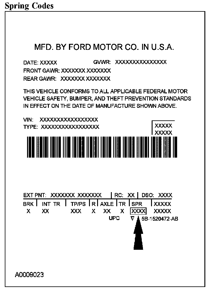 The spring code portion of the vehicle certification (VC) label identifies both the front and rear springs. The first set of characters listed indicate the front spring code. The second set of characters indicate the rear spring code.