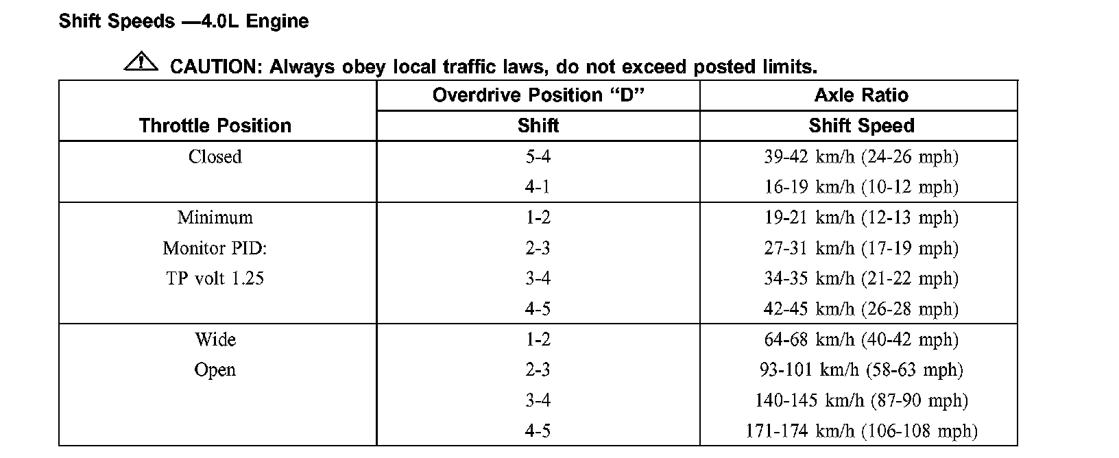 Shift Speeds - 4.0L Engine: