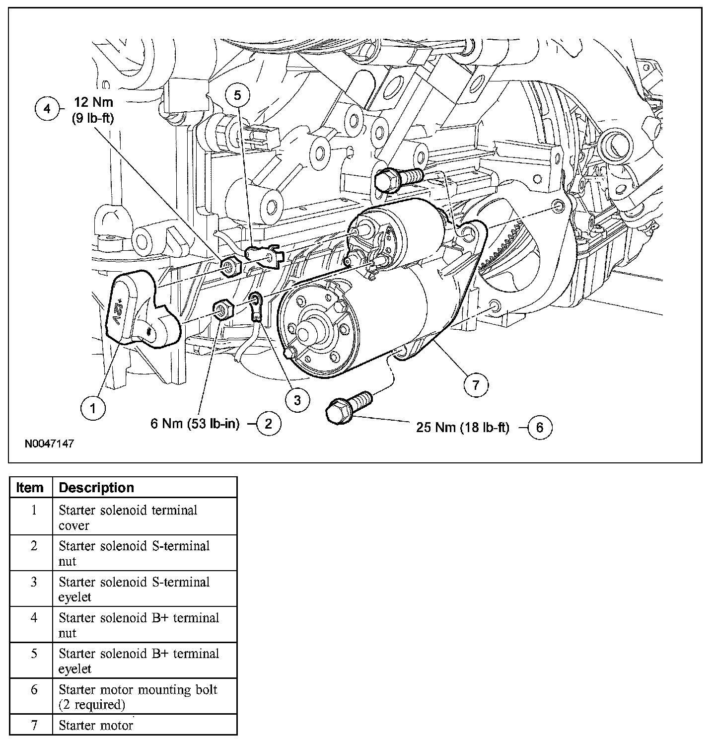 - Tighten the B+ terminal nut to 12 Nm (9 lb-ft) and the S-terminal nut to 6 Nm (53 lb-in).