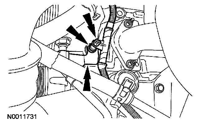 12. Install the power steering tube retaining clip and nut to the power steering stud bolt.