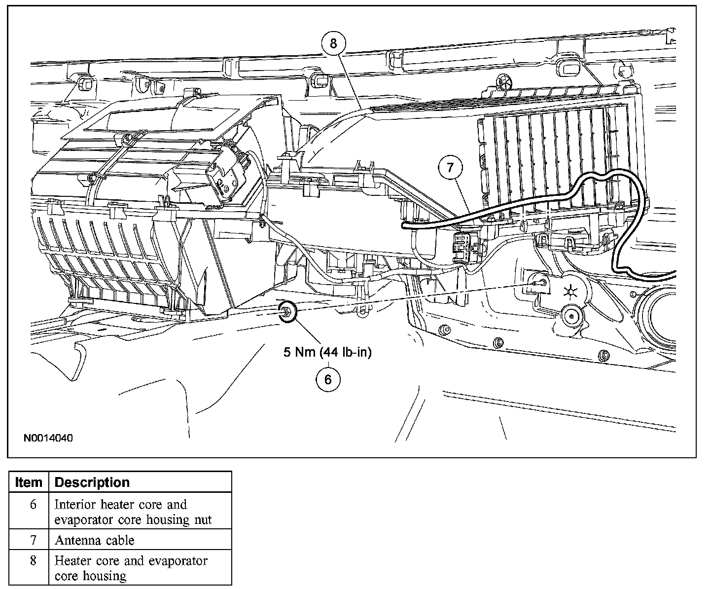 6. Detach the antenna cable from the heater core and evaporator core housing.