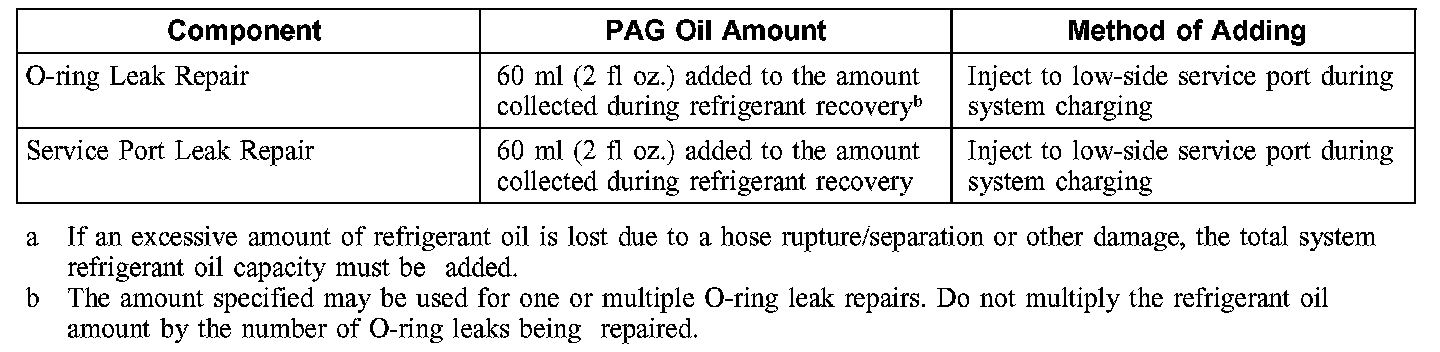 CAUTION: During normal A/C operation, oil is circulated through the system with the refrigerant, and a small amount is retained in each component. If certain components of the system are removed, some of the refrigerant oil will go with the component. To maintain the original total oil charge, it is necessary to compensate for the oil lost by adding oil to the system with the new part.