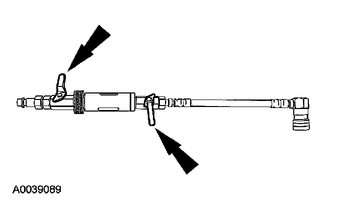 5. Install the dye/lubricant injector between the low-side service gauge port valve and the refrigerant service station or manifold gauge set.