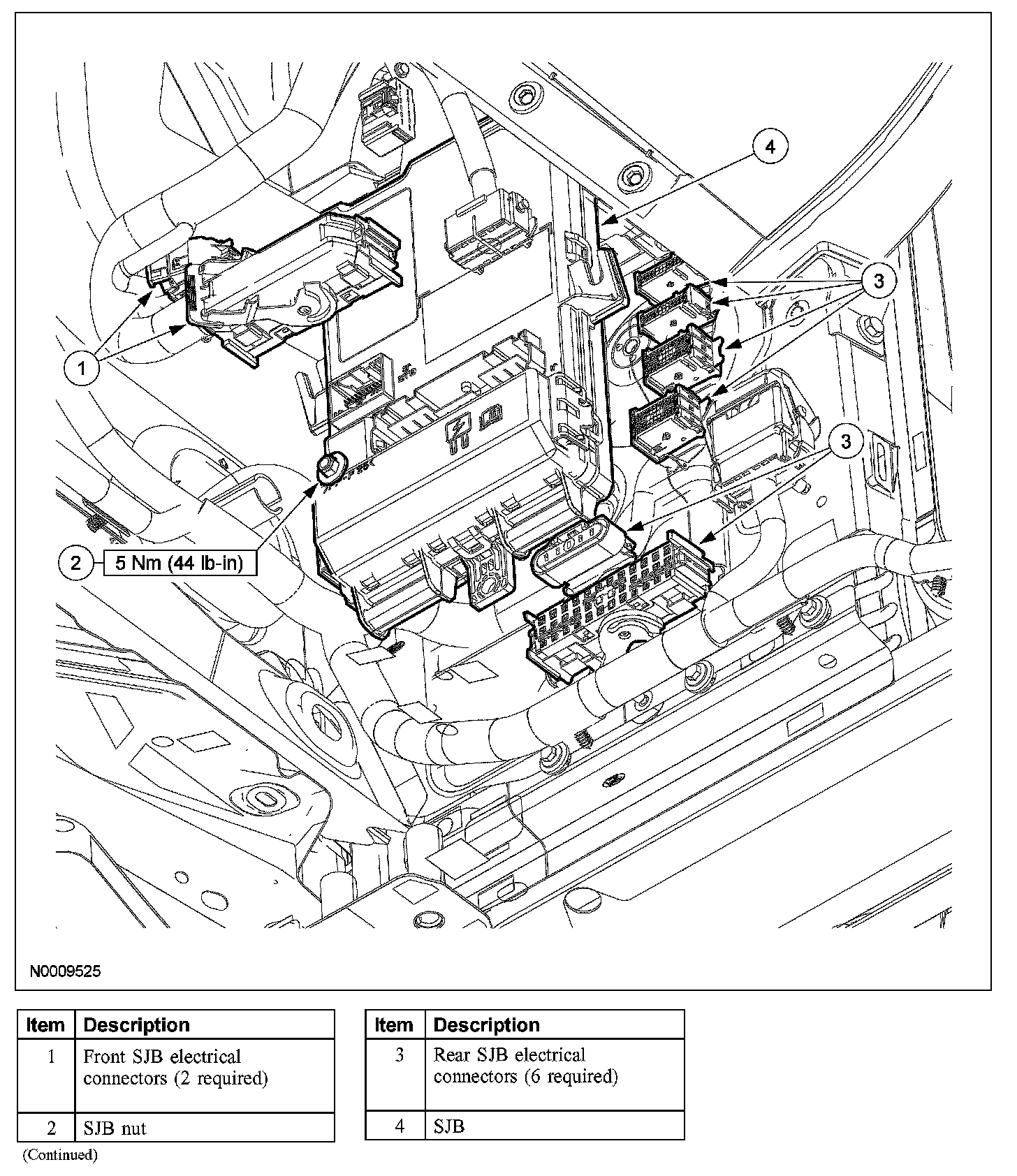 8. CAUTION: Make sure that the wiring harnesses are correctly routed. Pinching the wiring harnesses between the SJB and the mounting surface may cause damage to the wiring harness.