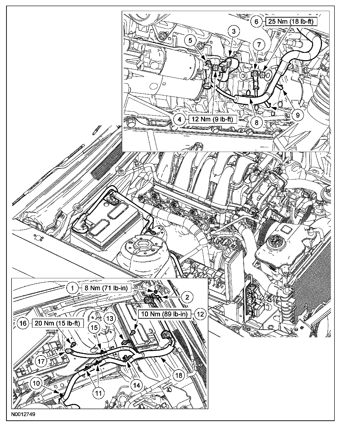 10. Remove the 2 battery cable harness locators from the RH strut tower.