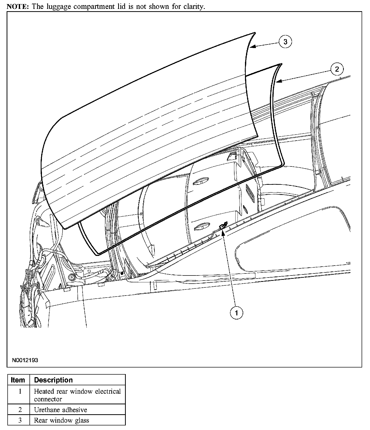 Using an appropriate tool (with the luggage compartment lid open approximately 45 degrees), starting at the bottom outboard corner of the rear window glass, cut the urethane adhesive from the glass.