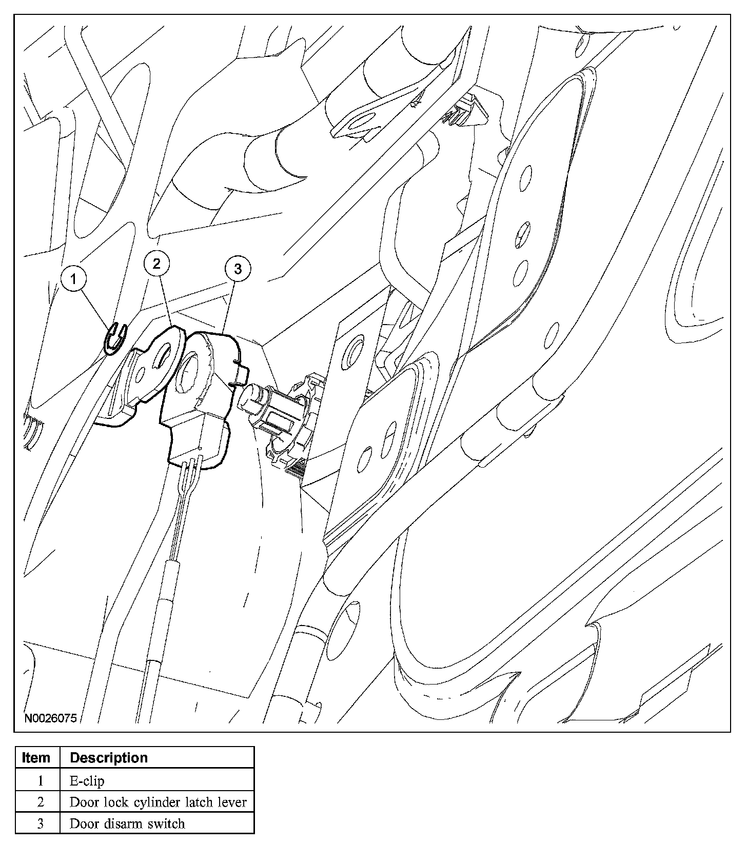 4. Remove the E-clip and disconnect the latch lever from the door lock cylinder.