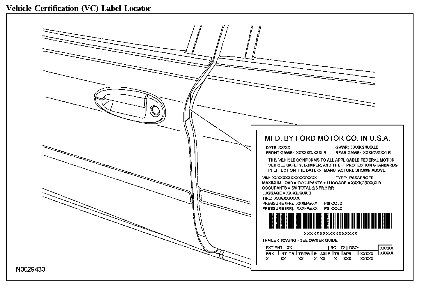 The vehicle certification (VC) label contains the manufacturer name, the month and year of manufacture, the certification statement and the VIN. It also includes gross vehicle weight ratings (GVWR).