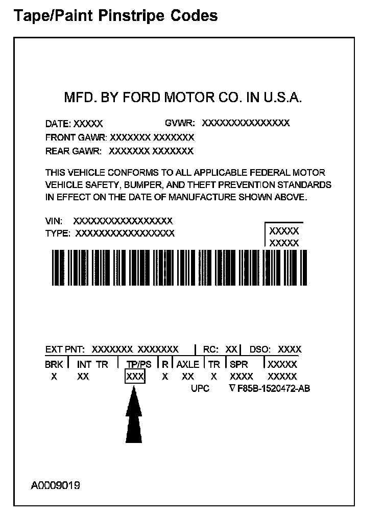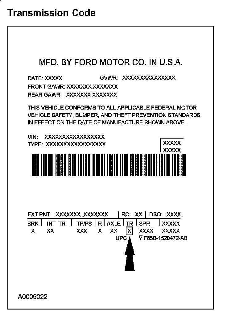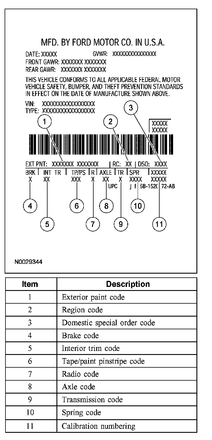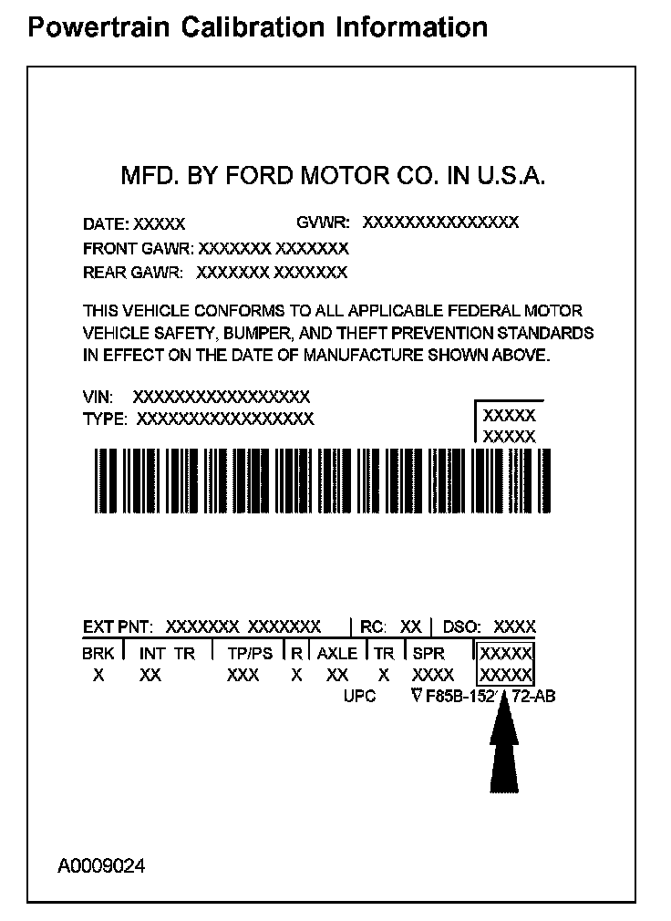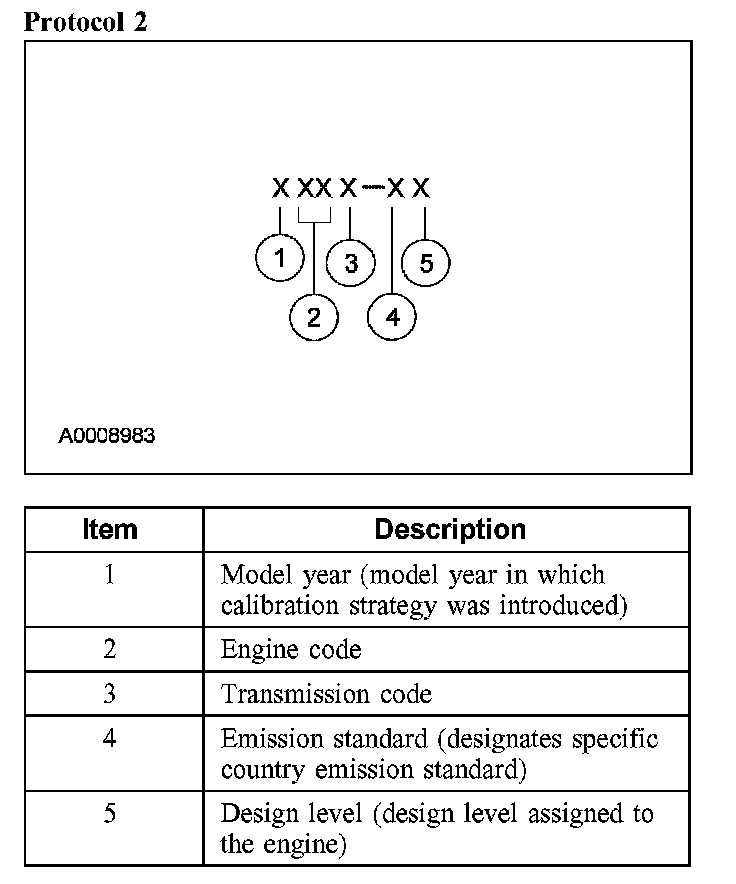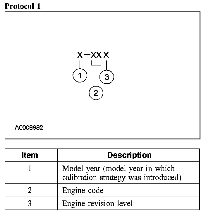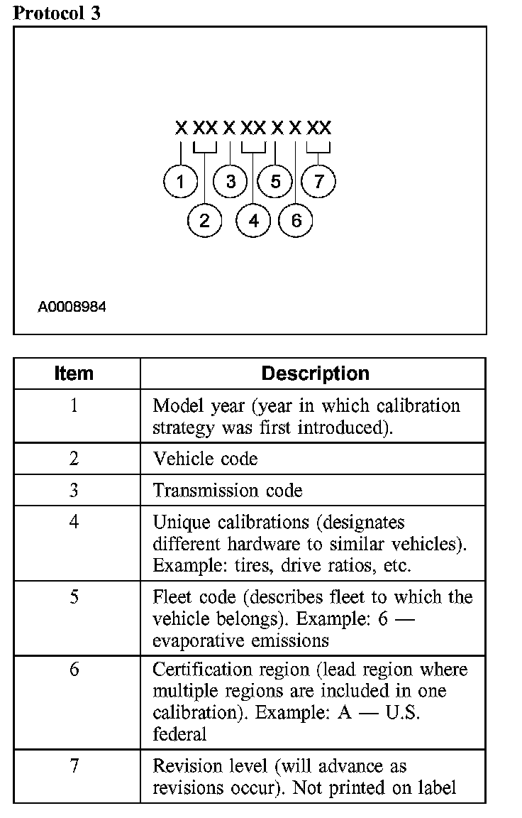 Powertrain calibration information is printed in the lower right corner of the VC label. Only the base calibration information is printed. Revision levels will not appear, however, they can be found in On Line Automotive Service Information System (OASIS). For the current model year, Ford Motor Company is using 3 different protocols which describe powertrain base calibration. These protocols are designed to provide worldwide standardization for vehicle calibration. If the electronic calibration strategy has been used since 1998 and carried into the current model year, Protocol 1 will be used. Refer to Protocol 1. If the electronic calibration strategy has been used since 1999 and is carried into the current model year, Protocol 2 will be used. Refer to Protocol 2. For electronic calibration strategies introduced in 2000 or later model years, Protocol 3 will be used. Refer to Protocol 3.