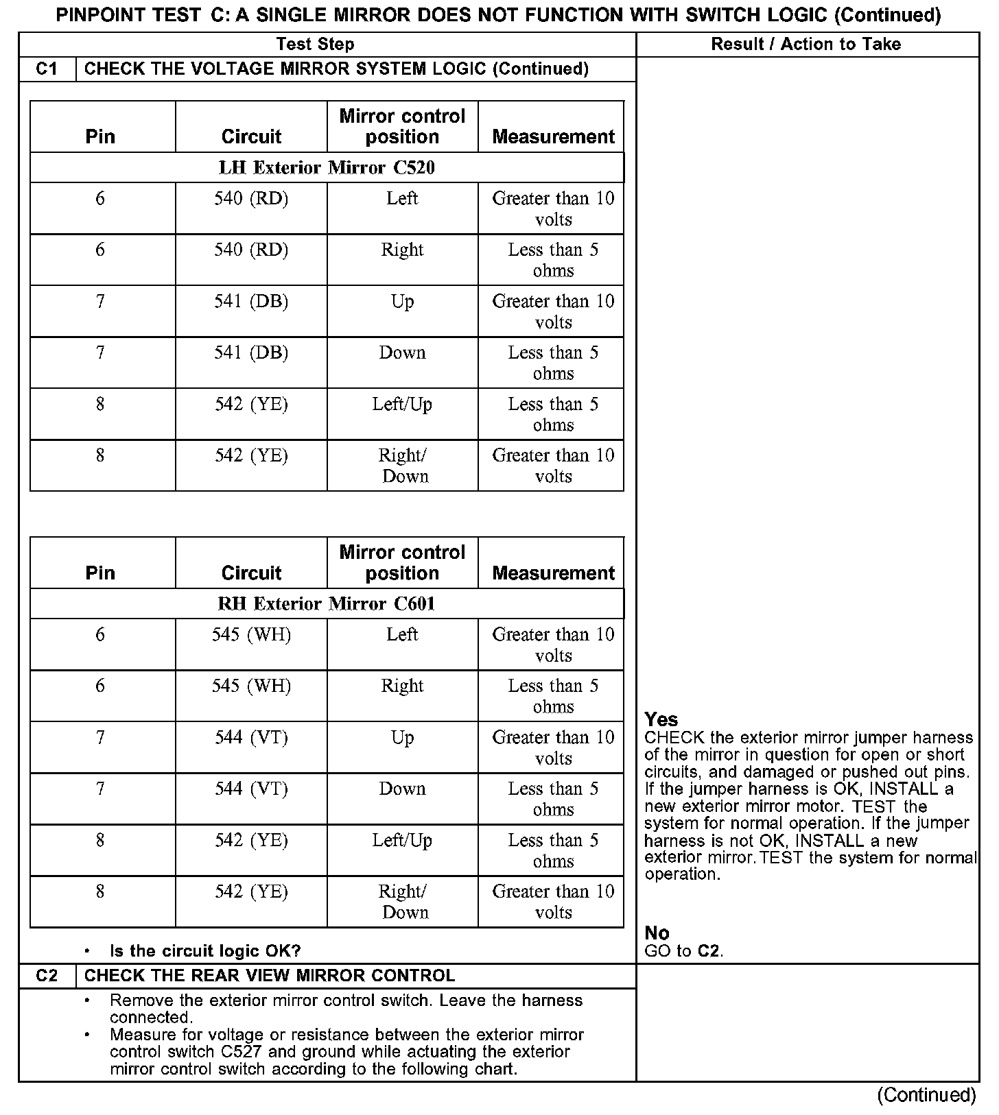 The exterior mirror control switch uses circuit 540 (RD) to control the LH exterior mirror left/right movement, circuit 541 (DB) to control the LH exterior mirror up/down movement, and circuit 542 (YE) as a common circuit to control the LH exterior mirror up/down and left right movement. The exterior mirror control switch uses circuit 545 (WH) to control the RH exterior mirror left/right movement, circuit 544 (VT) to control the RH exterior mirror up/down movement, and circuit 542 (YE) as a common circuit to control the RH exterior mirror up/down and left right movement. Each circuit is a switched voltage/ground circuit based upon the exterior mirror control switch position.