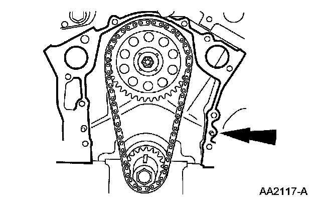 12. Install the timing chain, the camshaft sprocket and the crankshaft sprocket as an assembly with the timing marks aligned.