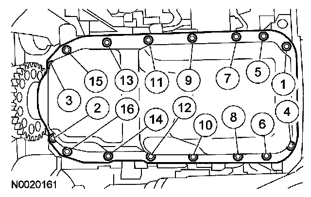 ^ Tighten the oil pan bolts to 12 Nm (9 ft. lbs.) in the sequence shown.