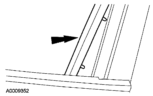 1. CAUTION: Due to the fragile make-up of the front door glass top run, removal is recommended only if the top run is damaged. Unnecessary removal may damage the light-gauge steel carrier insert within the rubber seal of the front door glass top run.