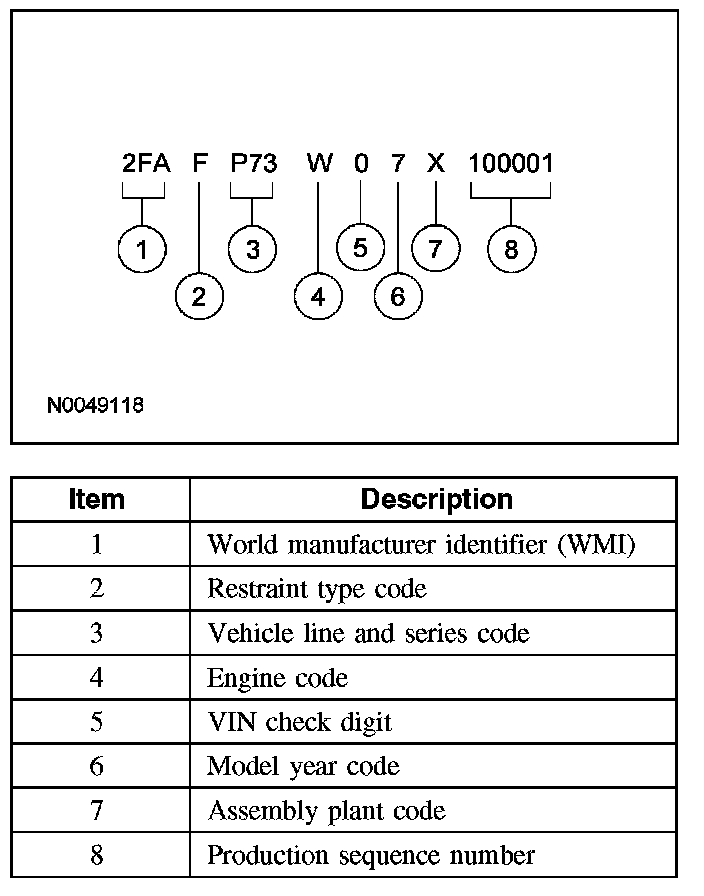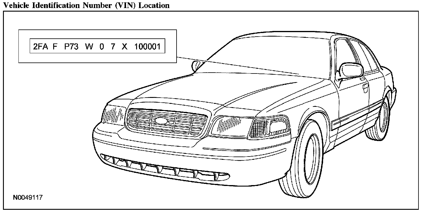 The vehicle identification number (VIN) is a 17-digit combination of letters and numbers. The VIN is stamped on a metal tab riveted to the instrument panel, top upper left of the dash. The VIN number is also found on the vehicle certification (VC) label.