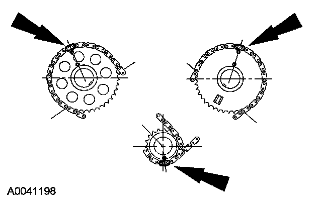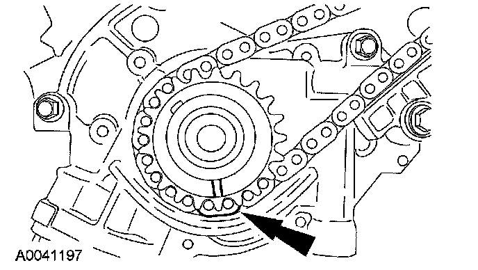 13. Rotate the RH camshaft sprocket until the timing mark is approximately at the 11 o'clock position. Rotate the LH camshaft sprocket until the timing mark is approximately at the 12 o'clock position.