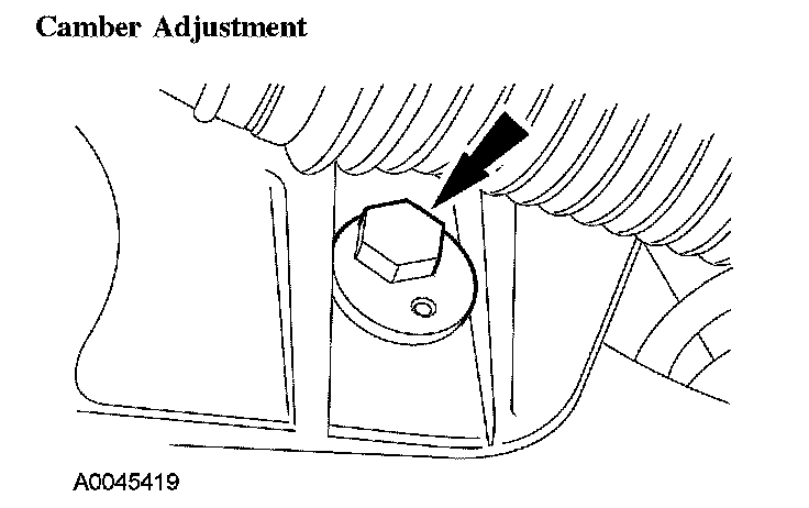 Camber is adjusted by rotating cam bolts that are located at the forward pivot bushing of the lower control arms. A retaining flag must be removed and discarded prior to adjusting.