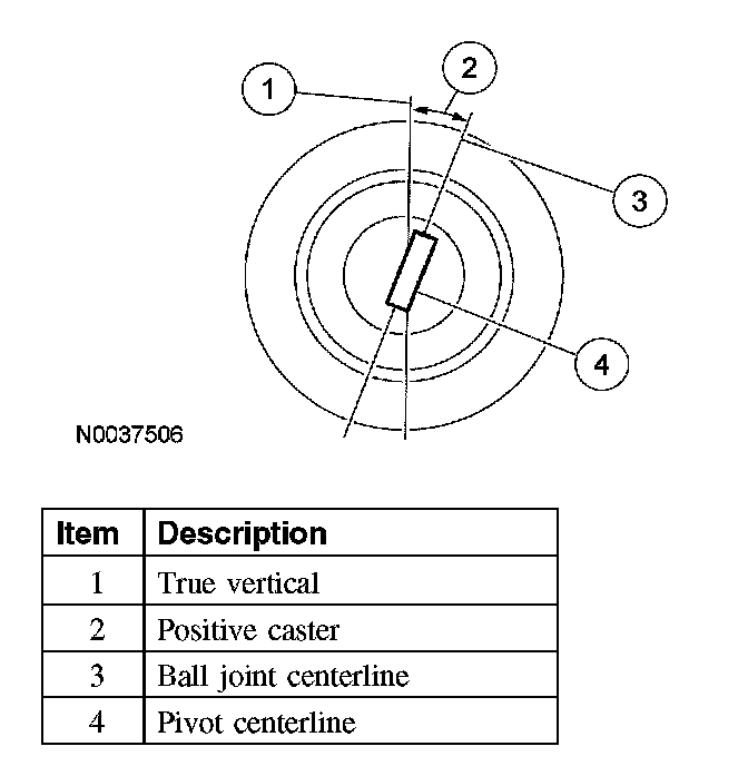 Caster is the deviation from vertical of an imaginary line drawn through the ball joints when viewed from the side. The caster specifications will give the vehicle the best directional stability characteristics when loaded and driven. The caster setting is not related to tire wear.