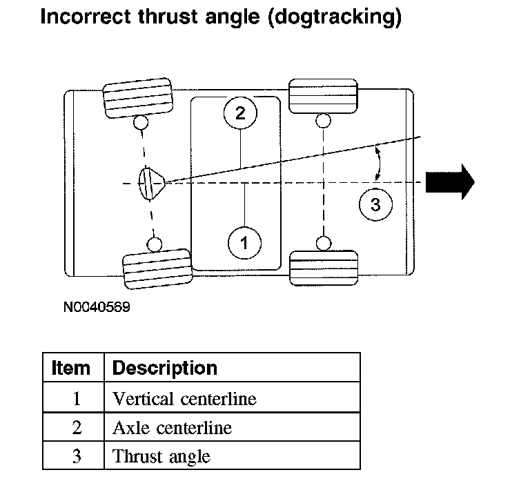 Incorrect thrust angle (dogtracking) is the condition in which the rear axle is not square to the chassis. Heavily crowned roads can give the illusion of dogtracking.