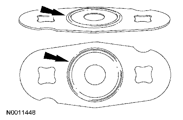 - Install a new EGR system module gasket with the side that has the raised circle facing the intake manifold.