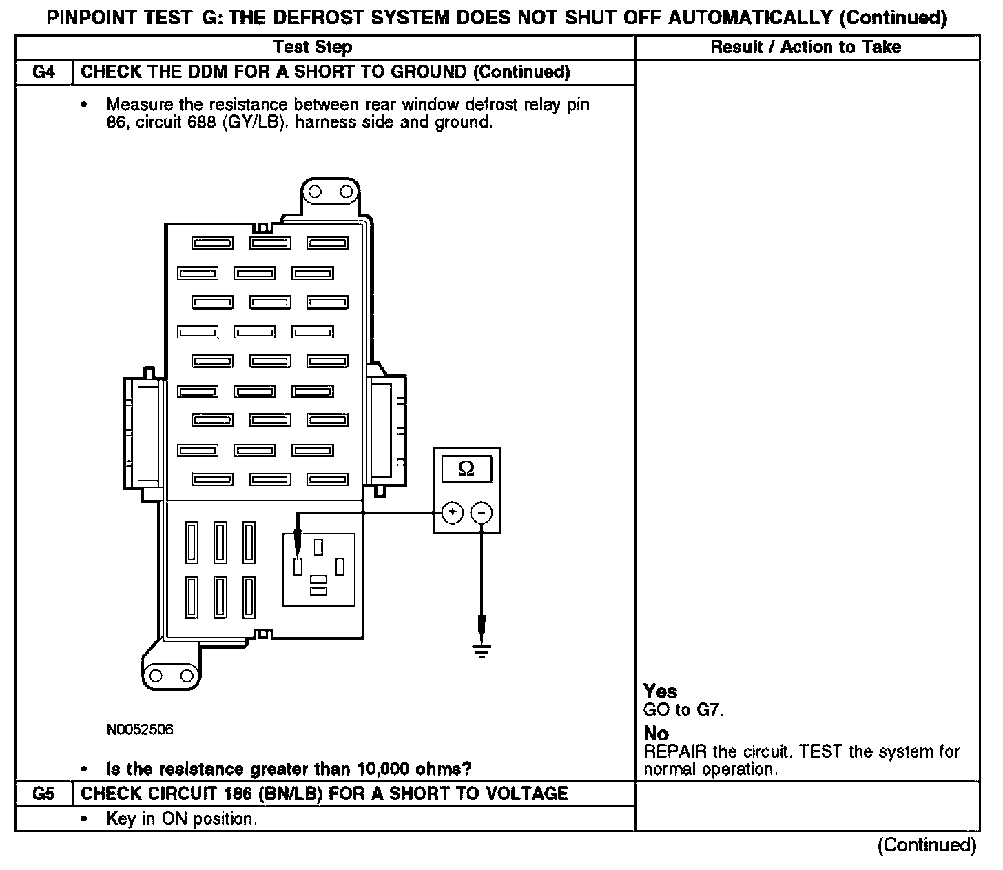 The key must be in the START or RUN position for the heated rear window to operate. When the rear window defrost switch is pressed, a momentary ground is supplied to the driver door module (DDM) through circuit 1010 (DB/OG). The DDM provides a ground for the rear window defrost relay coil on circuit 688 (GY/LB). When the rear window defrost relay coil is energized, the relay switch closes, providing voltage to the heated rear window grid, the heated rear window indicator, and the heated exterior mirror (if equipped) through circuit 186 (BN/LB). The heated rear window grid and the rear window defrost switch are grounded through circuit 57 (BK).