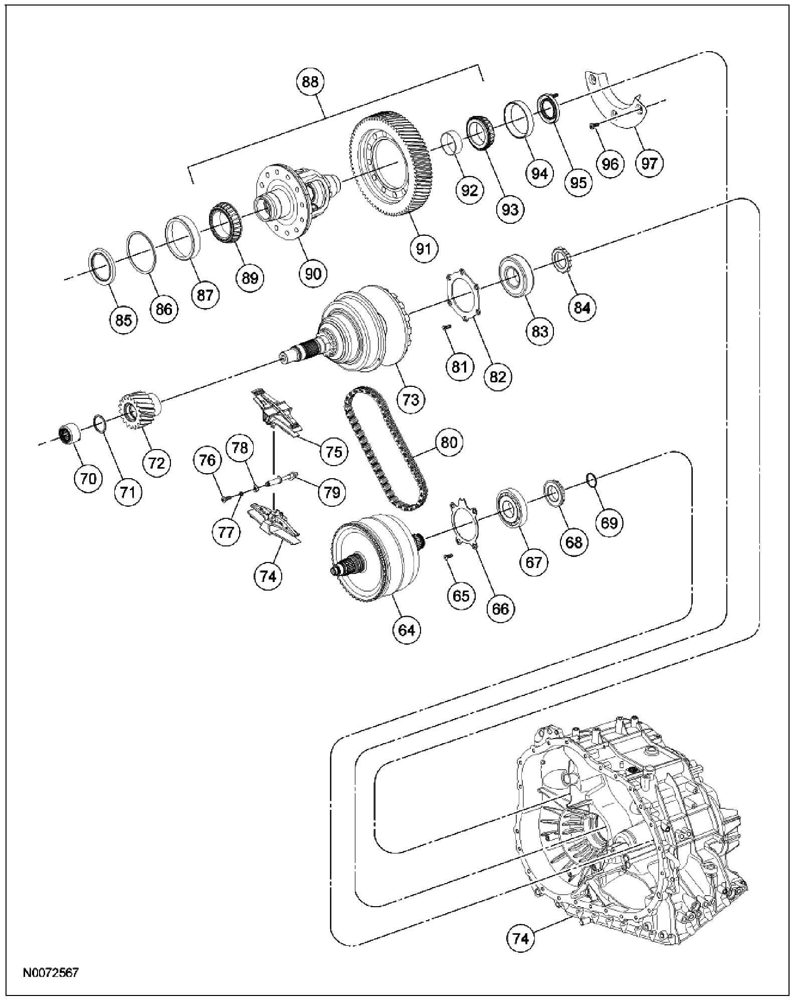 1. CAUTION: Prior to installing the transaxle case onto the variator assembly, make sure that the manual valve feed tube is correctly installed in the case. Damage to the manual valve feed and variator could occur if not correctly installed.