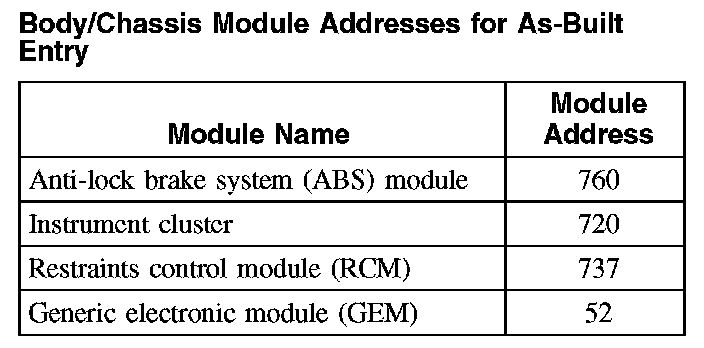 As-Built data is a VIN specific module configuration record. During vehicle build, the configuration from all modules is downloaded and stored in the As-Built database. As Built data will not reflect customer preference items that have been changed from the default state. These items will need to be changed using programmable parameters after the module is configured.