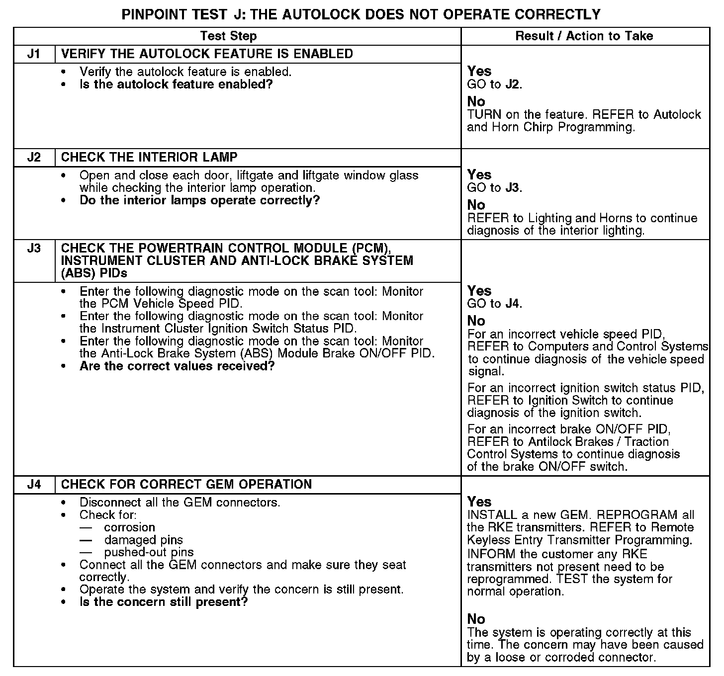 PINPOINT TEST J: THE AUTOLOCK DOES NOT OPERATE CORRECTLYJ1-J4: