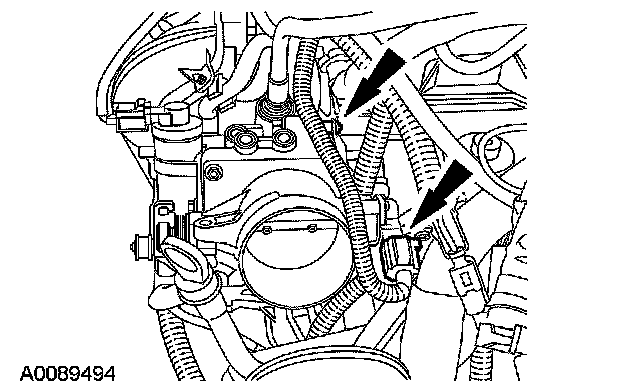 117. Connect the throttle position (TP) sensor electrical connector and wiring harness pin-type retainer.