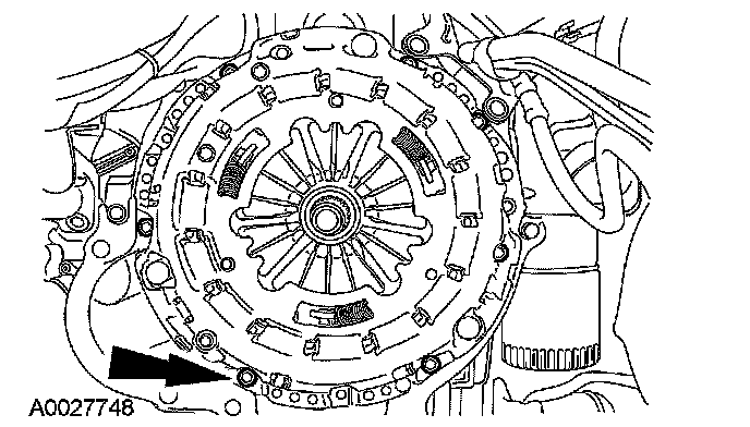 Position the clutch pressure plate and install the 7 bolts. Tighten the bolts in a star pattern sequence to 27 Nm (20 ft. lbs.).