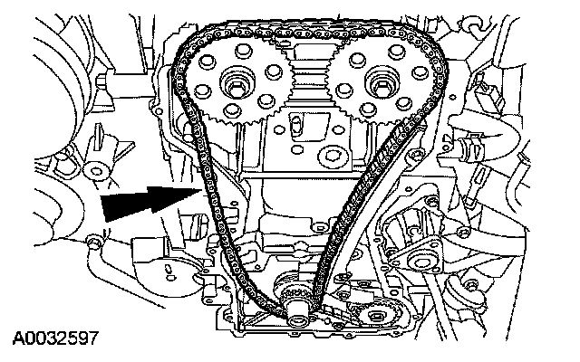 1 Compress the timing chain tensioner and insert a paper clip into the hole.