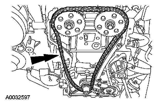 7. Install the timing chain tensioner and the bolts. Remove the paper clip to release the piston.