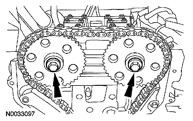 3. If removed, install the camshaft sprockets and the bolts. Do not tighten the bolts at this time.