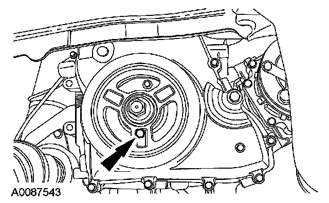 CAUTION: Do not loosen or remove the crankshaft pulley bolt without first installing the special tools as instructed in this procedure. The crankshaft pulley and the crankshaft timing sprocket are not keyed to the crankshaft. The crankshaft, the crankshaft sprocket and the pulley are fitted together by friction, using diamond washers between the flange faces on each part. For that reason, the crankshaft sprocket and the pulley are fitted together by friction, using diamond washers between the flange faces on each part. For that reason, the crankshaft sprocket is also unfastened if you loosen the pulley bolt. Before any repair requiring loosening or removal of the crankshaft pulley bolt, the crankshaft and camshafts must be locked in place by the special service tools, otherwise severe engine damage can occur.