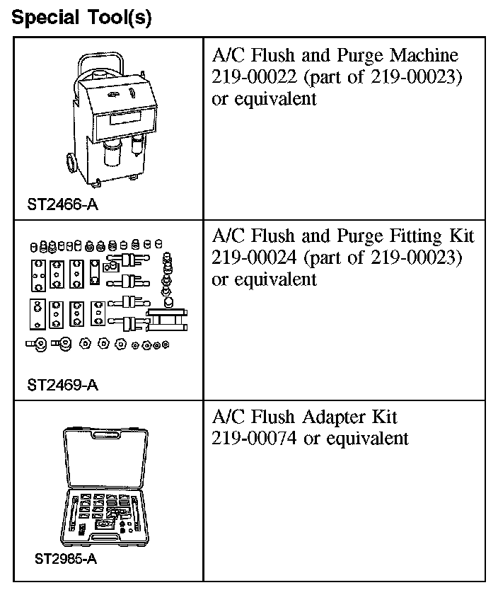 - Only the A/C Flush and Purge Machine kit 219-00023, which includes A/C Flush and Purge Machine 219-00022, A/C Flush and Purge Fitting Kit 219-00024 and A/C Systems Flushing Solvent, is approved for use on Ford vehicles. No other flushing device or solvent is approved for flushing heat exchangers (A/C condenser, A/C evaporator). Use of any other flusher or solvent may cause damage to the A/C system and the flushing unit.