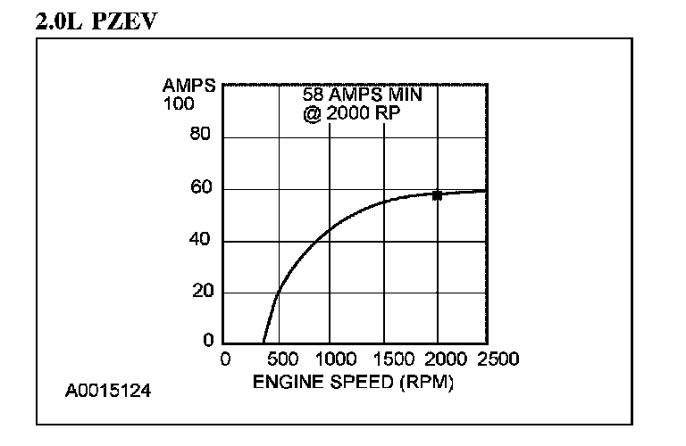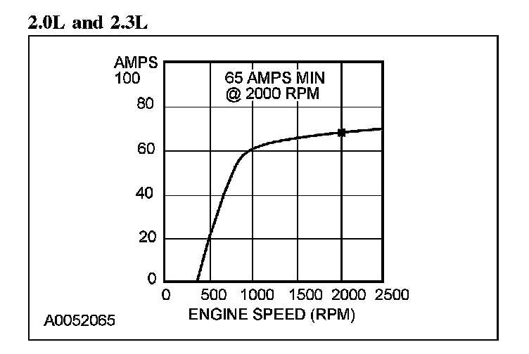 4. With the engine running at approximately 2,000 rpm, adjust the tester load bank to determine the output of the generator. The generator output should be greater than in the applicable graph shown. If not, refer back to the pinpoint test or GO to Symptom Chart. Pinpoint Tests Symptom Related Diagnostic Procedures