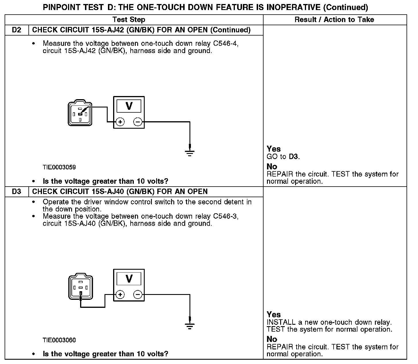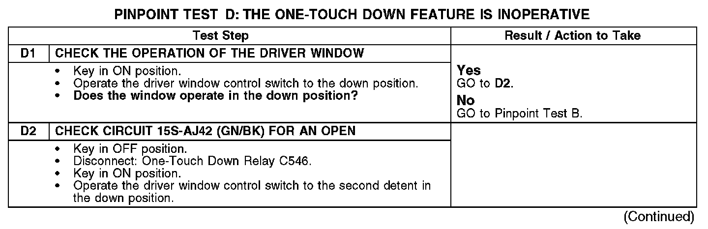 With the ignition switch in the START or RUN position, voltage is supplied to the driver window control switch from the central junction box (CJB) on circuits 15-AJ1 (GN/BU), 15-LH14 (GN/YE) and 15-AJ7 (GN/BU). Circuit 15-LH14 (GN/YE) is spliced off circuit 15-AJ1 (GN/BU) and provides voltage to the switch illumination light emitting diodes (LED). Circuit 15-AJ7 (GN/BU) is spliced off circuit 15-AJ1 (GN/BU) and provides voltage for the driver window control, the front passenger window control and the driver window one-touch down control. Circuit 15-AJ15 (GN/BK) is spliced off 15-AJ1 (GN/BU) and provides voltage to the one-touch down relay (switch side). The driver window control switch is grounded through circuit 31-AJ7 (BK). The one-touch down relay is grounded through circuit 31-AJ15 (BK). When the driver window control switch is moved to the one-touch down position, voltage is supplied to the one-touch down relay coil on circuit 15S-AJ40 (GN/BK) and 15S-AJ42 (GN/BK). The one-touch down relay is switched from ground contact to voltage contact providing voltage to the driver window motor on circuit 32-AJ26 (WH). The driver window motor is connected to the driver window control switch on circuit 33-AJ26 (YE) which provides ground.