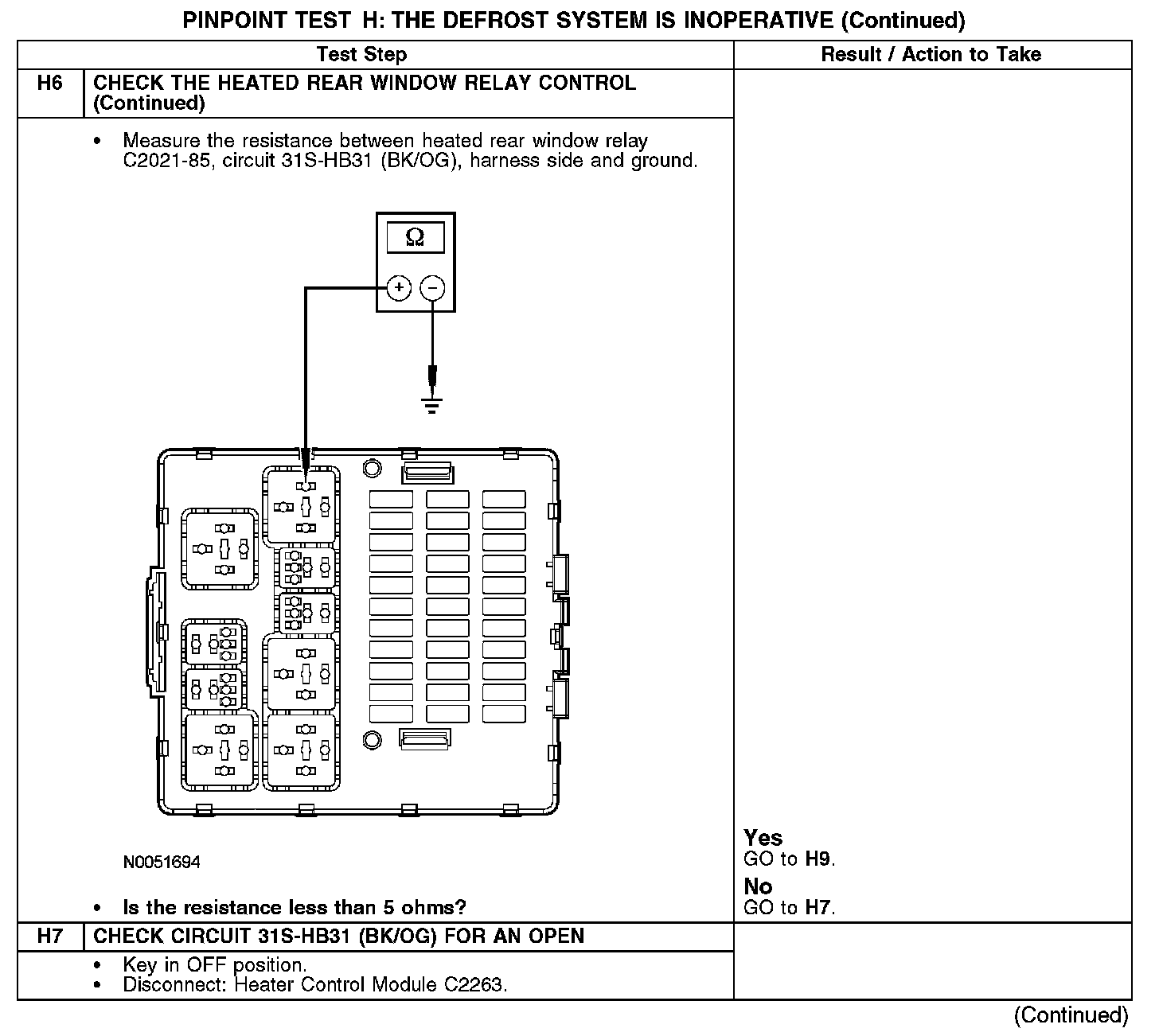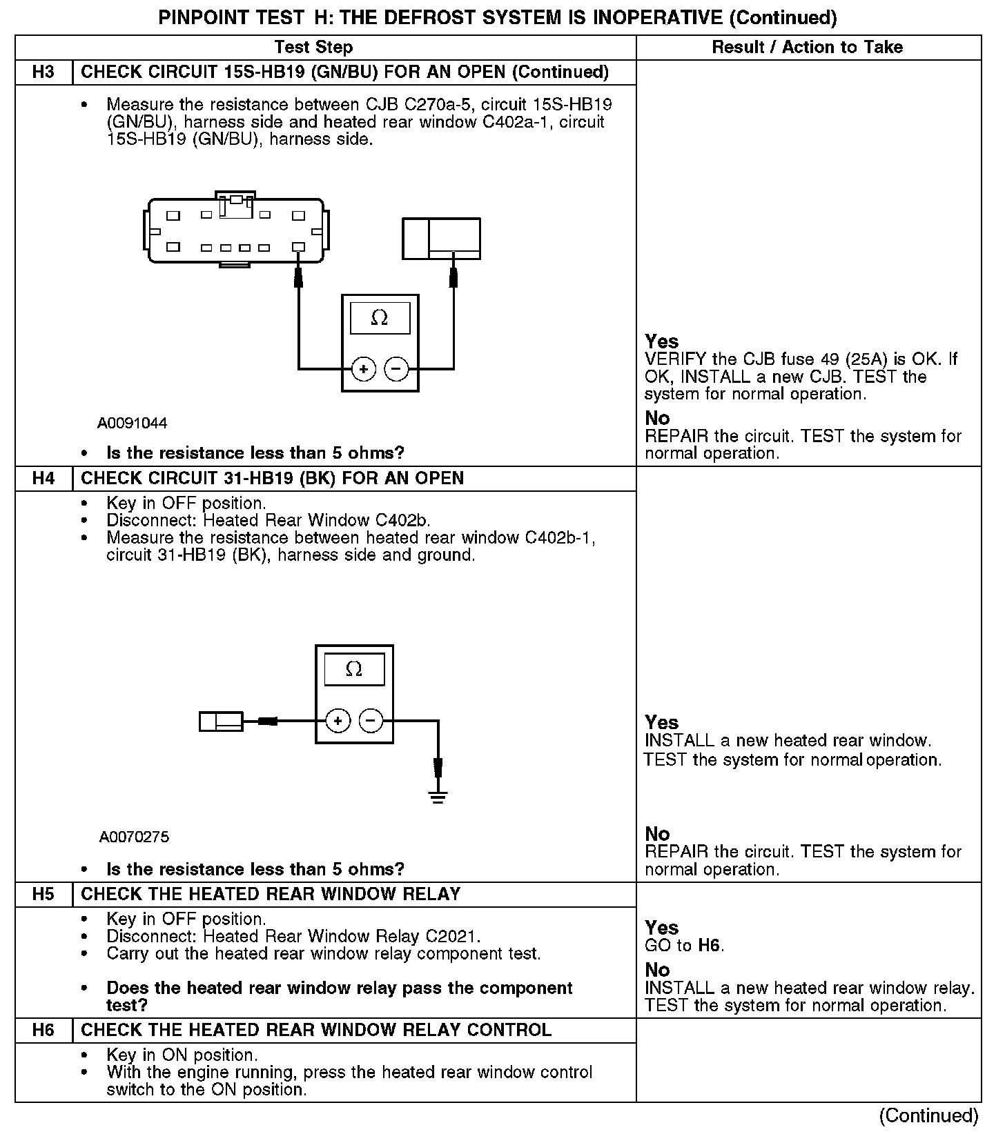 With the key in the START or RUN position and the rear window heater switch turned to the on position, the rear window defrost relay is energized providing voltage to the rear window defrost grid on circuit 15S-HB19 (GN/BU), the LH exterior rear view mirror on circuit 15S-HB35 (GN/BK) and the RH exterior rear view mirror on circuit 15S-HB36 (GN/OG). On 3-door and 5-door models, the rear window defrost grid is connected directly to ground. For all other models, the rear window defrost grid is connected to ground through circuit 31-HB19 (BK). The LH exterior rear view mirror is grounded through circuit 31-HB35 (BK). The RH exterior rear view mirror is grounded through circuit 31-HB36 (BK).