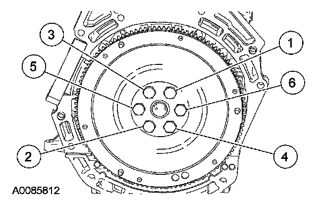Install the flywheel and tighten the bolts in the sequence shown in 3 stages.