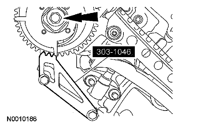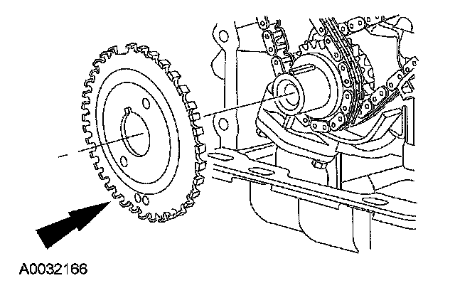 15. CAUTION: Damage to the camshaft phaser sprocket assembly will occur if mishandled or used as a lifting or leveraging device.
