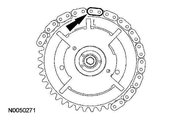 Position the LH timing chain on the camshaft sprocket. Make sure the camshaft sprocket timing mark is aligned with the copper (marked) chain link.
