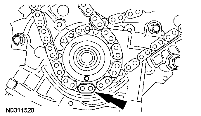 13. Position the lower end of the LH (inner) timing chain on the crankshaft sprocket, aligning the timing mark on the outer flange of the crankshaft sprocket with the single copper (marked) link on the chain.
