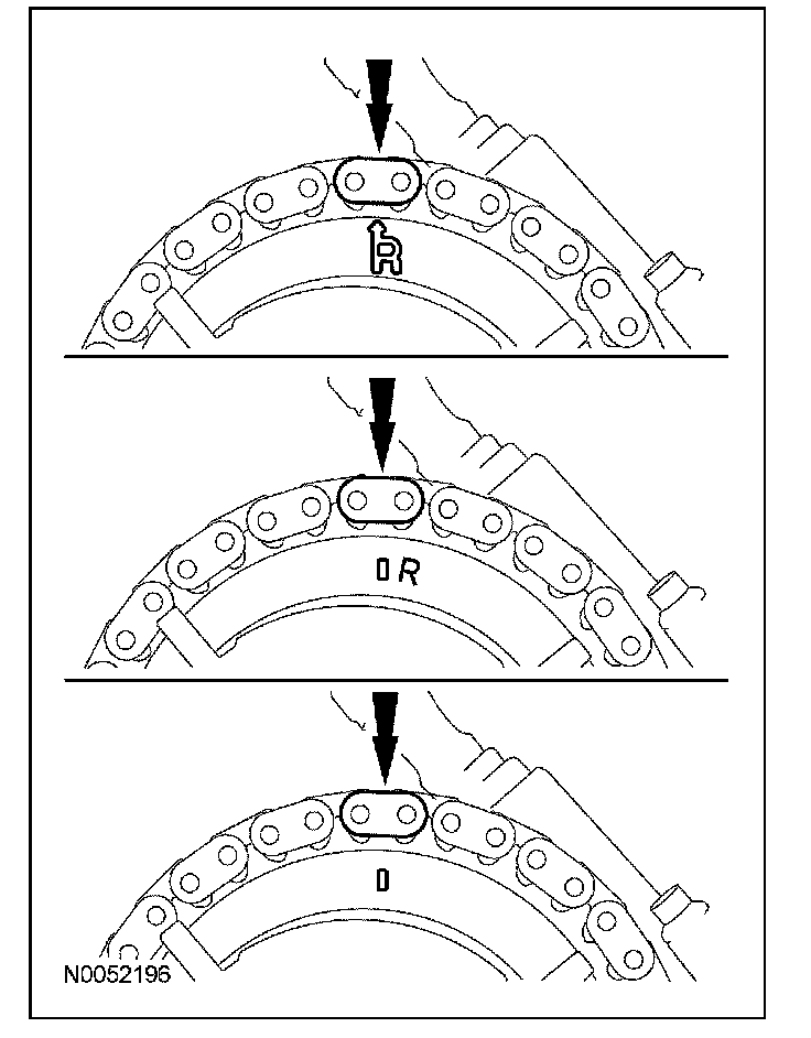 17. Position the lower end of the RH (outer) timing chain on the crankshaft sprocket, aligning the timing mark on the sprocket with the single copper (marked) chain link.