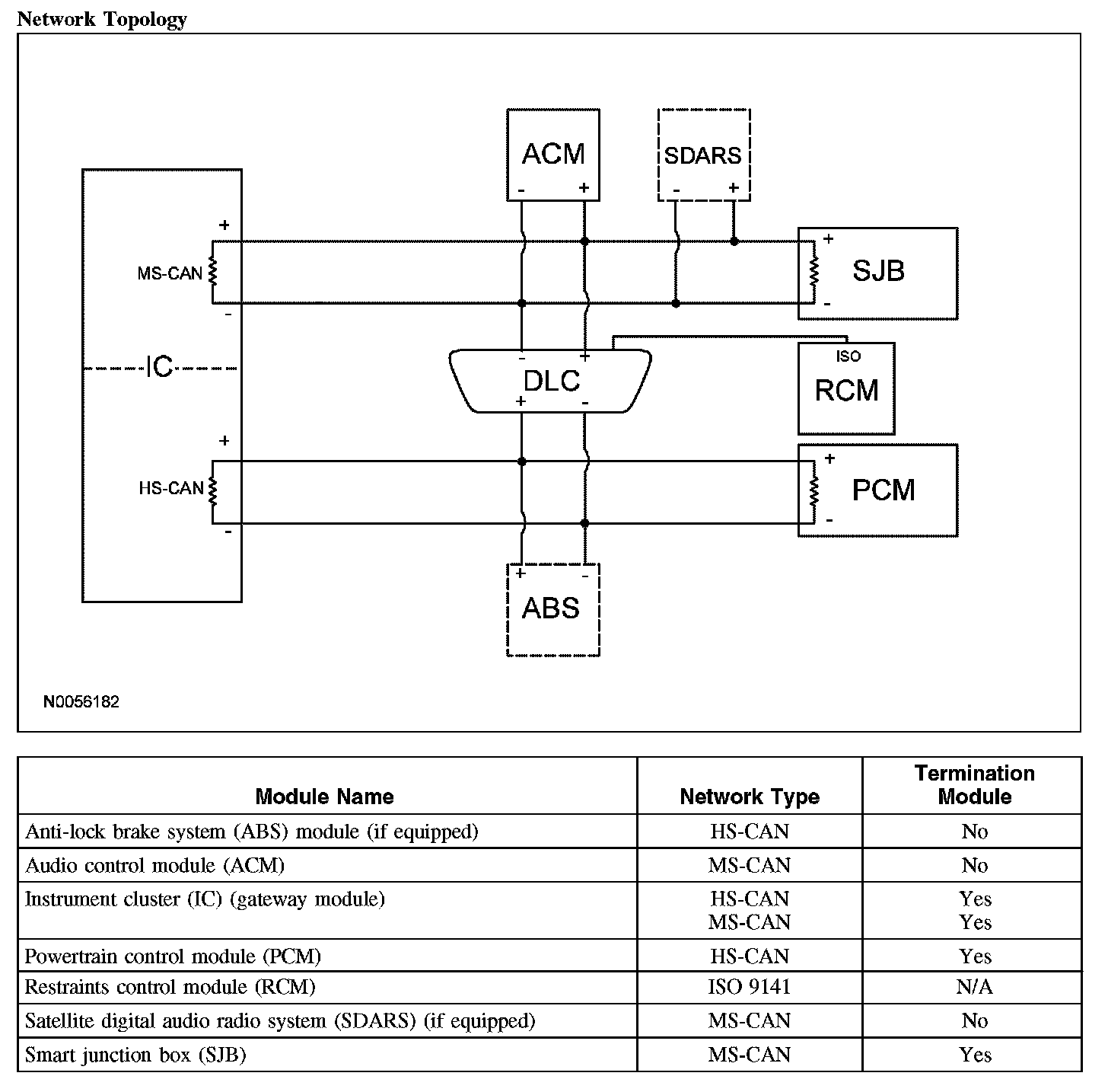 The instrument cluster is the gateway module, translating HS-CAN to MS-CAN and vice versa. This information allows a message to be distributed throughout both networks. The instrument cluster is the only module on this vehicle that has this ability.