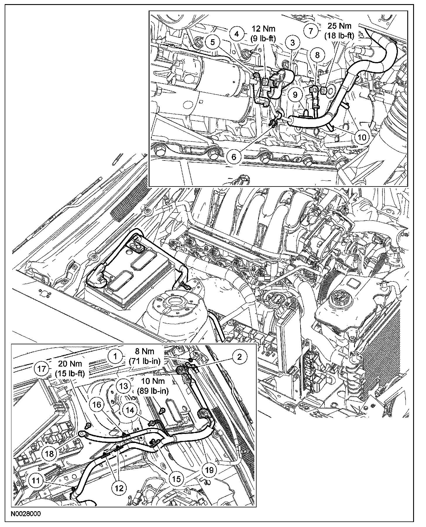 11. Remove the 2 battery cable harness locators from the RH strut tower.