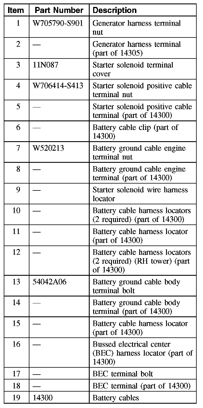 8. Remove the starter solenoid wire harness locator from the battery cable harness.