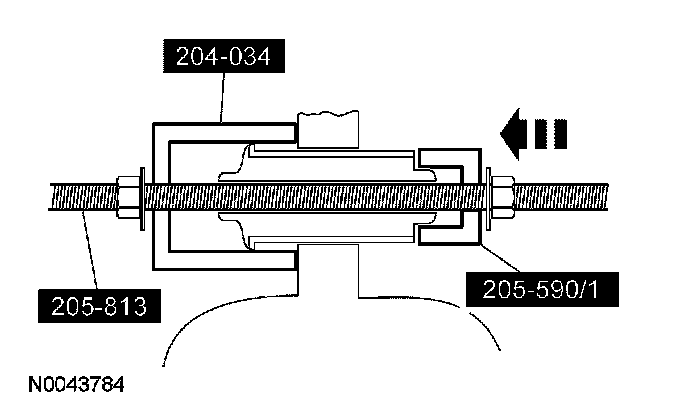 5. Partially lower the rear axle and, using the special tools, remove the upper control arm bushing.